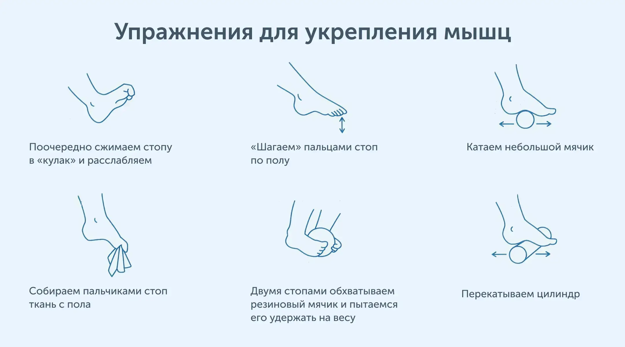 – Ежедневная гимнастика для стоп. Включите в распорядок дня (возможно, в качестве зарядки) простые упражнения: ходьбу на носках и пятках, перекаты с пятки на носок, захват карандашей пальцами ног.